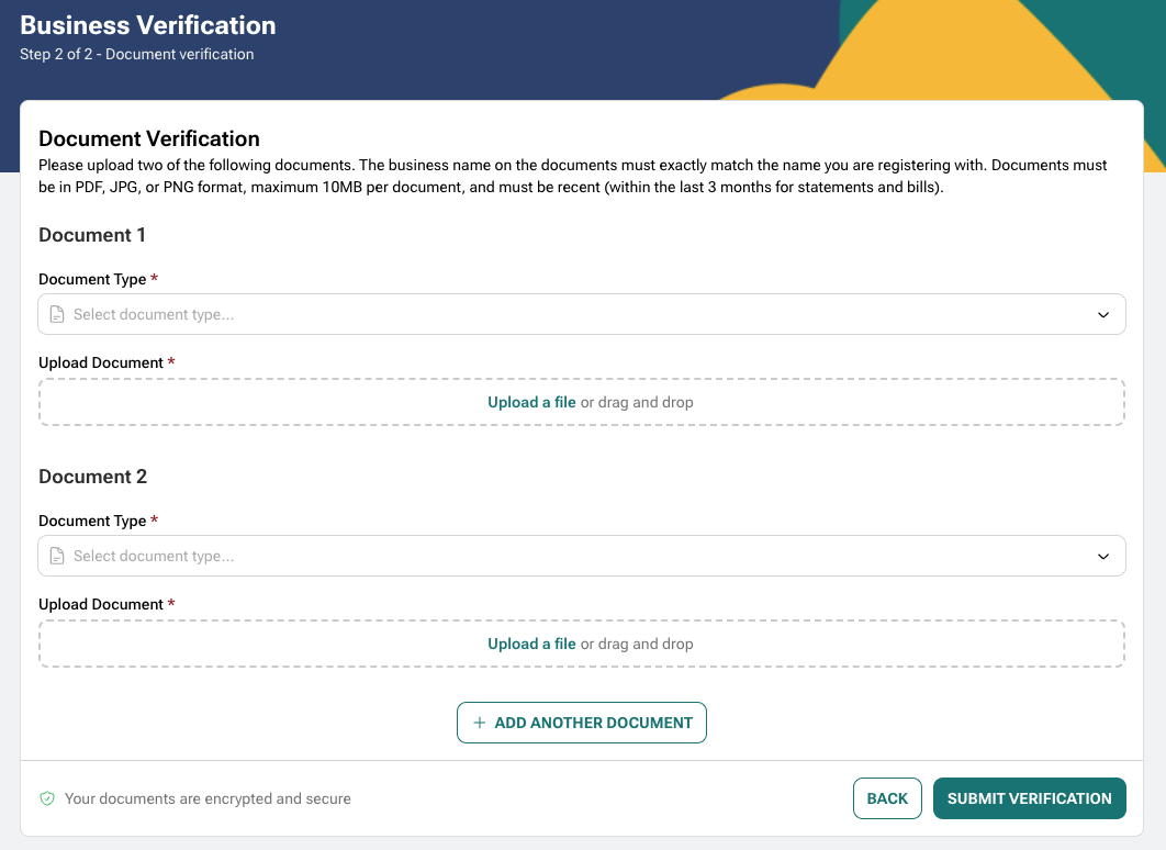 There are two ways to verify your business. The first is lite verification which if you have previously submitted an invoice to us that has been paid, will presented as an option. If you are unable to verify via this method, then you can go through the 'document' verification process.