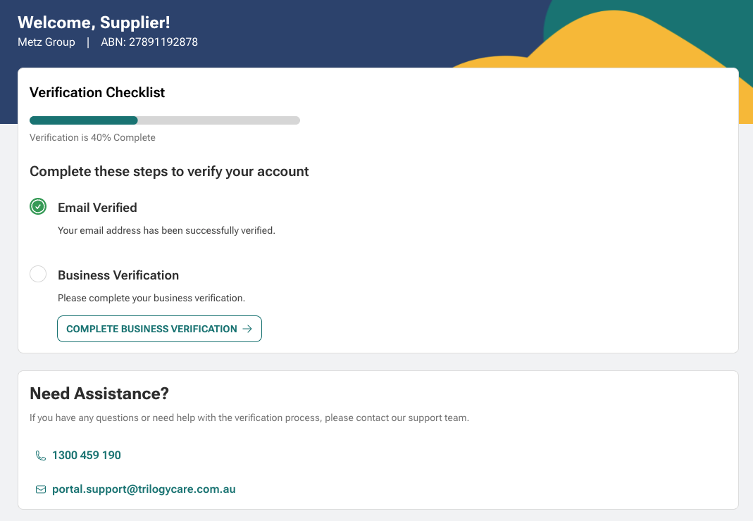 Once you have registered, the first step is to verify your business. Once you have completed the verification step, you can begin to complete the information required to onboard your organisation as a provider of services to Trilogy Care clients.