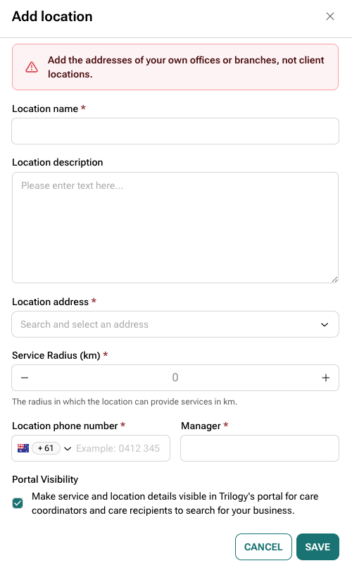 The next step is to add your service locations. Click on the 'Add location' button to get started.
