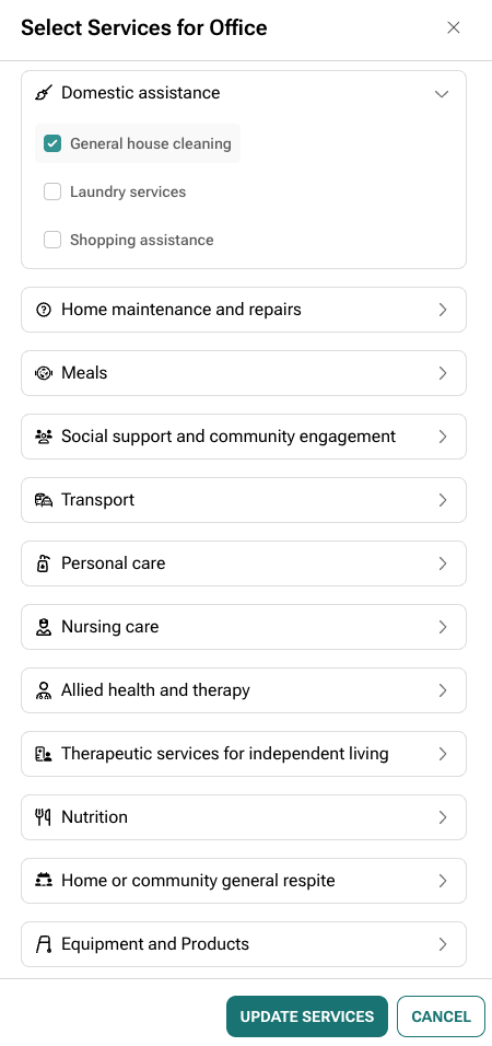 Select the services that you offer at this location. Expand the drop down categories to view the specific services that you can offer. You can select as many services as you offer, but will be required to enter pricing for each one.